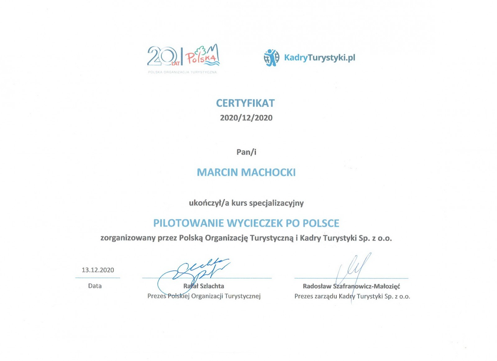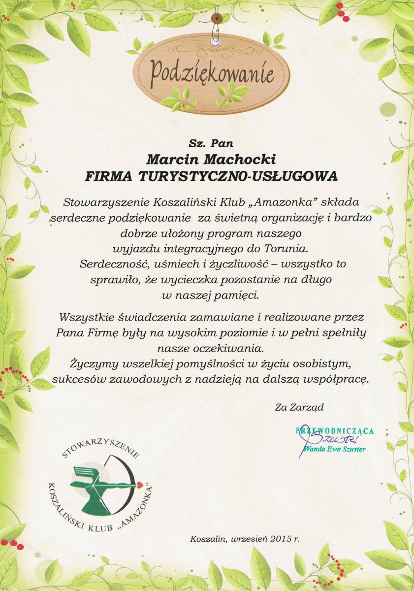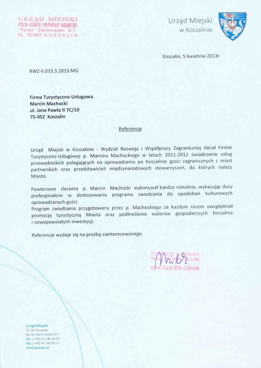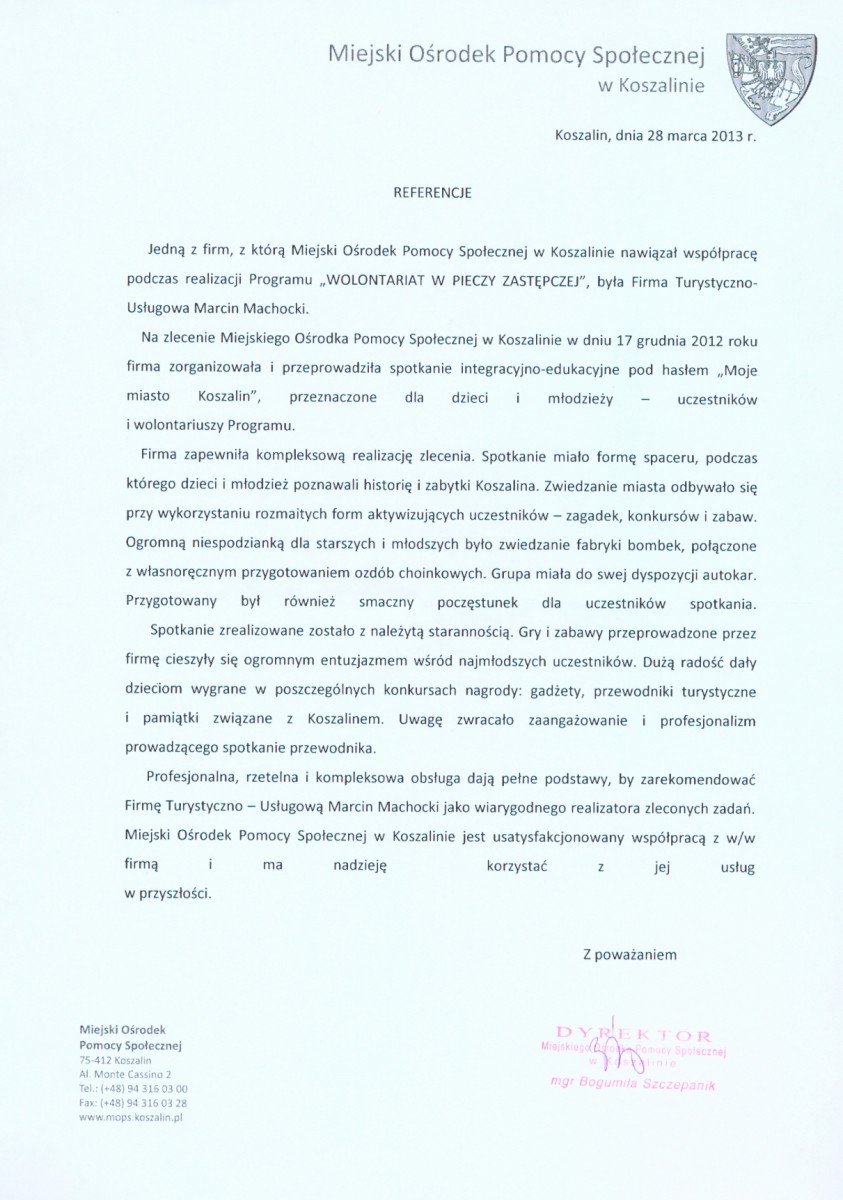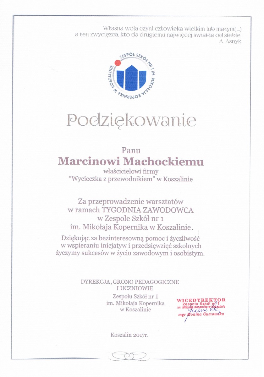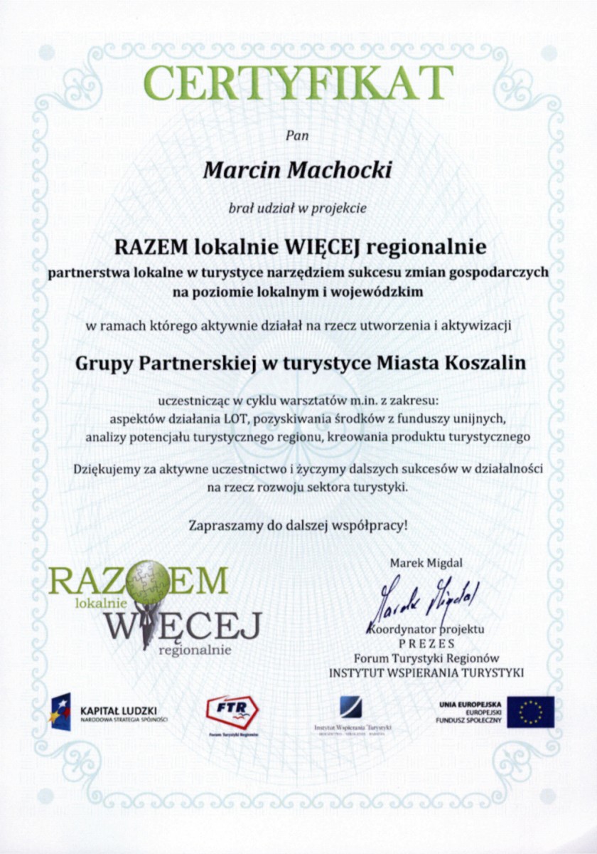 Wycieczka z przewodnikiem Marcin Machocki działa na rynku turystycznym od 2009 roku. Jej właścicielem jest rodowity koszalinianin, Marcin Machocki - licencjonowany przewodnik (uprawnienia przewodnika terenowego - woj. zachodniopomorskie) i pilot wycieczek, który łączy pracę z pasją i swoimi zainteresowaniami. Z branżą turystyczno-hotelarską związany jest już od 2003 roku. Doświadczenie w zarządzaniu zdobywał jako kierownik Ośrodka Rehabilitacyjno-Wypoczynkowego w Sarbinowie Morskim.