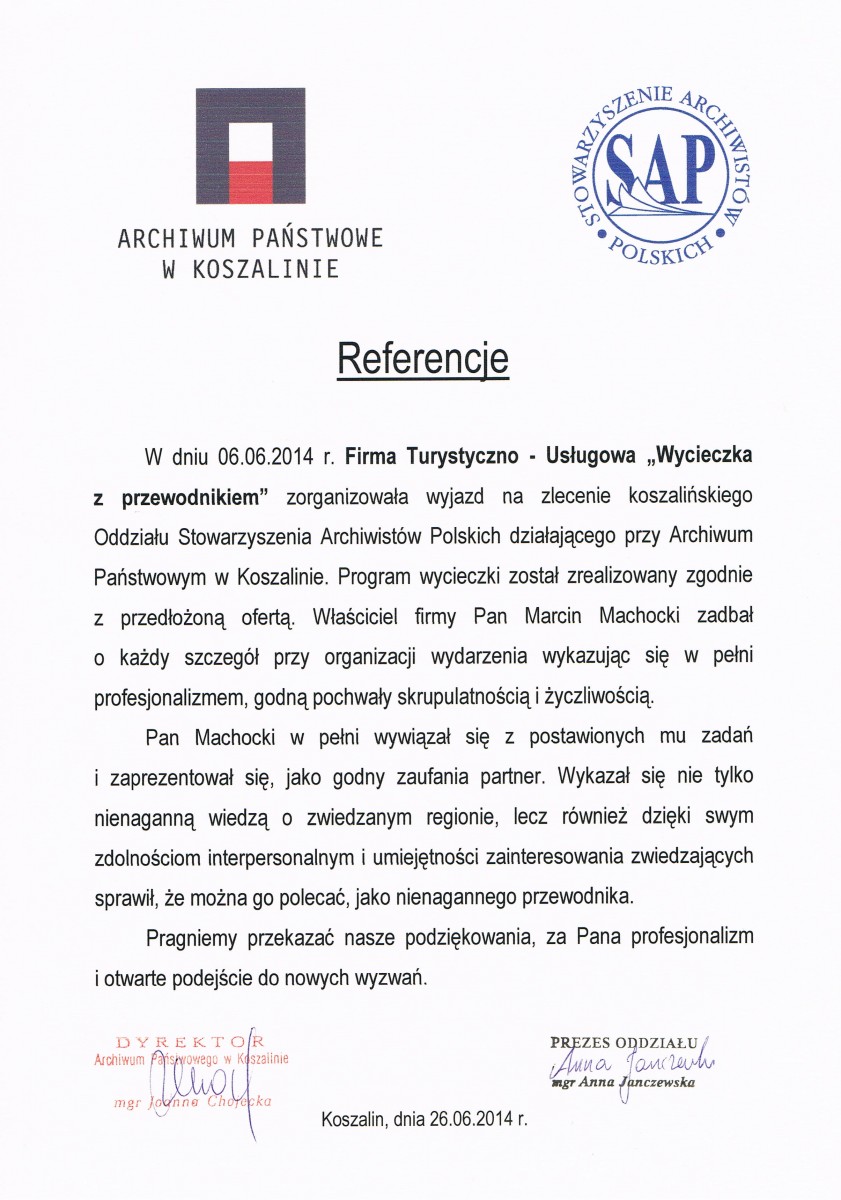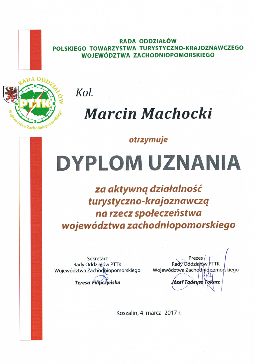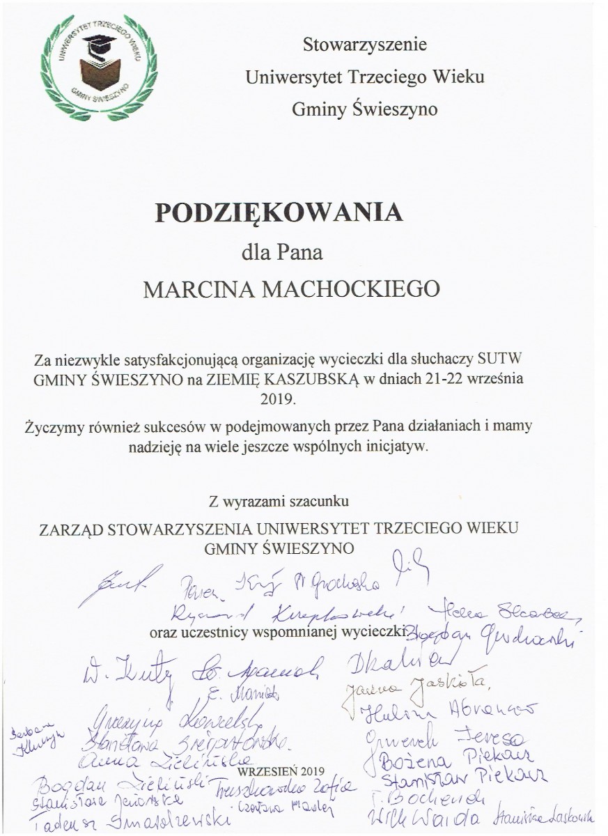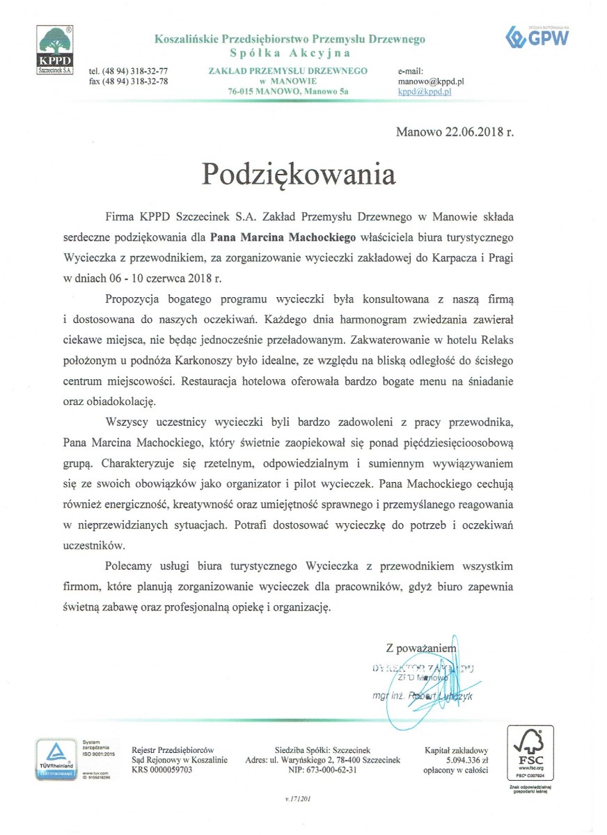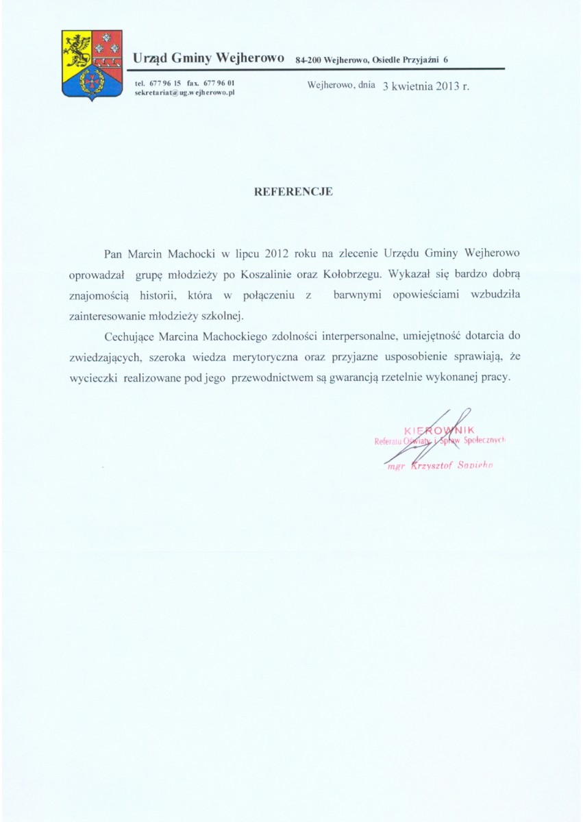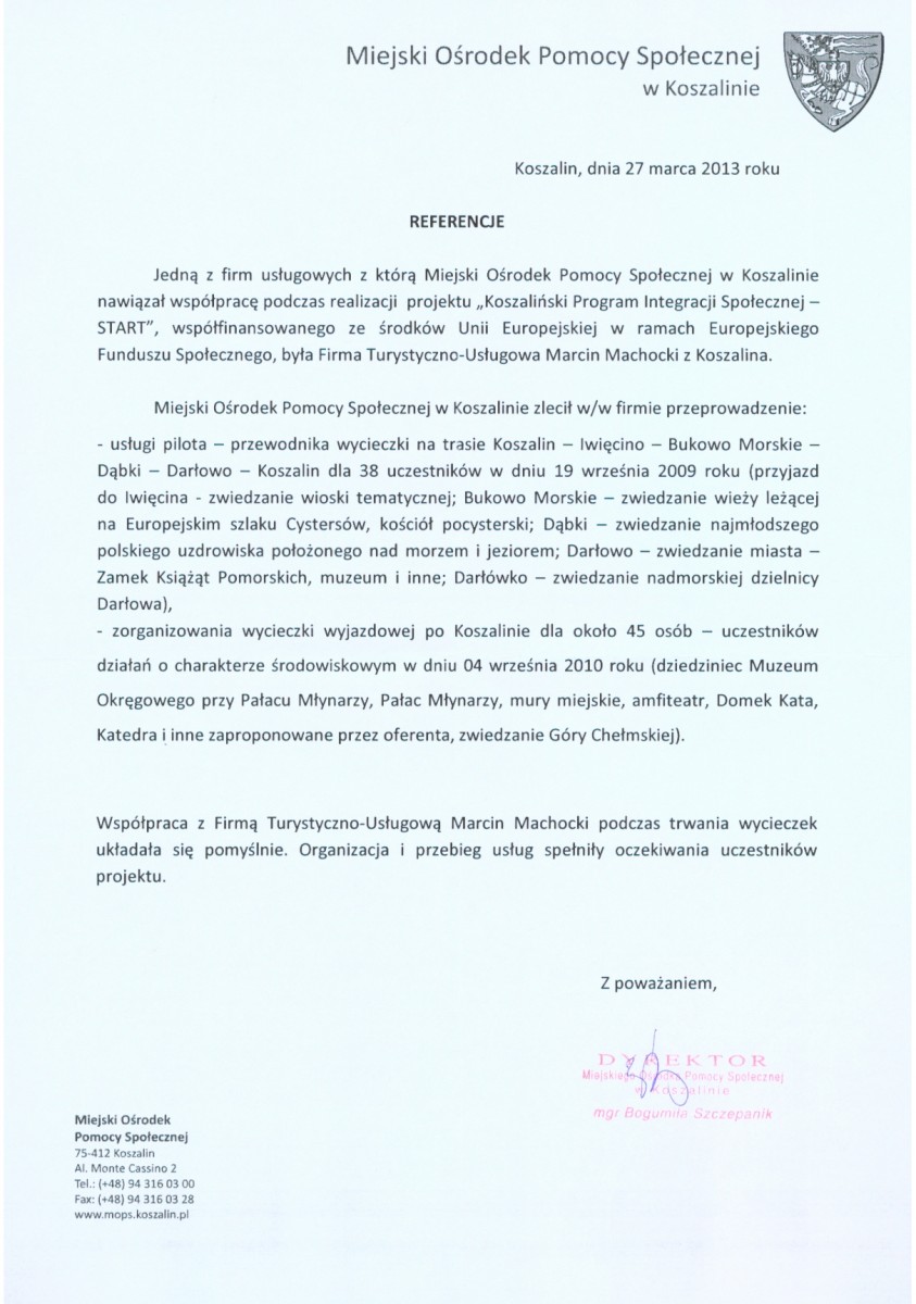 Wycieczka z przewodnikiem Marcin Machocki działa na rynku turystycznym od 2009 roku. Jej właścicielem jest rodowity koszalinianin, Marcin Machocki - licencjonowany przewodnik (uprawnienia przewodnika terenowego - woj. zachodniopomorskie) i pilot wycieczek, który łączy pracę z pasją i swoimi zainteresowaniami. Z branżą turystyczno-hotelarską związany jest już od 2003 roku. Doświadczenie w zarządzaniu zdobywał jako kierownik Ośrodka Rehabilitacyjno-Wypoczynkowego w Sarbinowie Morskim.